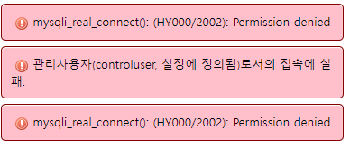 Warning: mysqli_connect(): (HY000/2002): Permission denied in /var/www/html/index.php on line "mysqli_real_connect(): (HY000/2002): Permission denied" "관리사용자(controluser, 설정에 정의됨)로서의 접속에 실패." 와 같은 오류 발생 시 localhost 대신 127.0.0.1를 사용하면 해결됩니다. phpmyadmin에서는 /etc/phpmyadmin/config-db.php 파일에서 $dbserver 변수를 127.0.0.1로 바꿔주시면 됩니다~